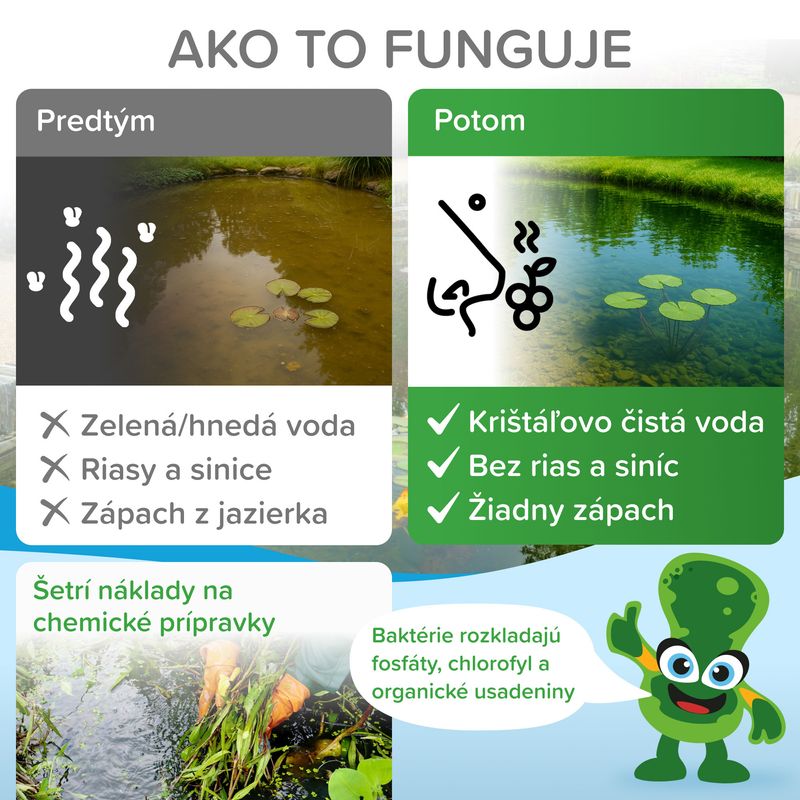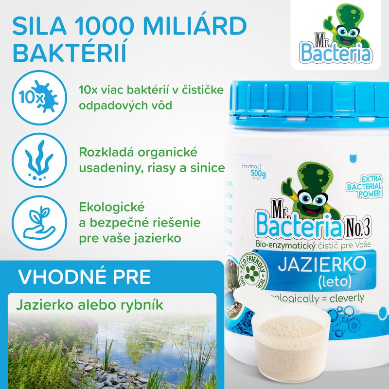 Mr.Bacteria No.3 je špeciálny biologický aktivátor určený na udržiavanie čistoty a ekologickej rovnováhy v záhradných jazierkach a rybníčkoch. Obsahuje prírodné baktérie, ktoré aktívne vyhľadávajú a rozkladajú organické nečistoty vo vode aj na dne jazierka. Prípravok efektívne odstraňuje kal a zákal vo vode, rozkladá organické usadeniny, čím eliminuje hnedú a zakalenú vodu. Redukuje riasy a sinice tým, že baktérie rozkladajú živiny podporujúce ich rast, a zároveň znižuje fosfáty a chlorofyl A, čím prispieva k dlhodobo čistej vode a udržuje ekologickú rovnováhu jazierka.