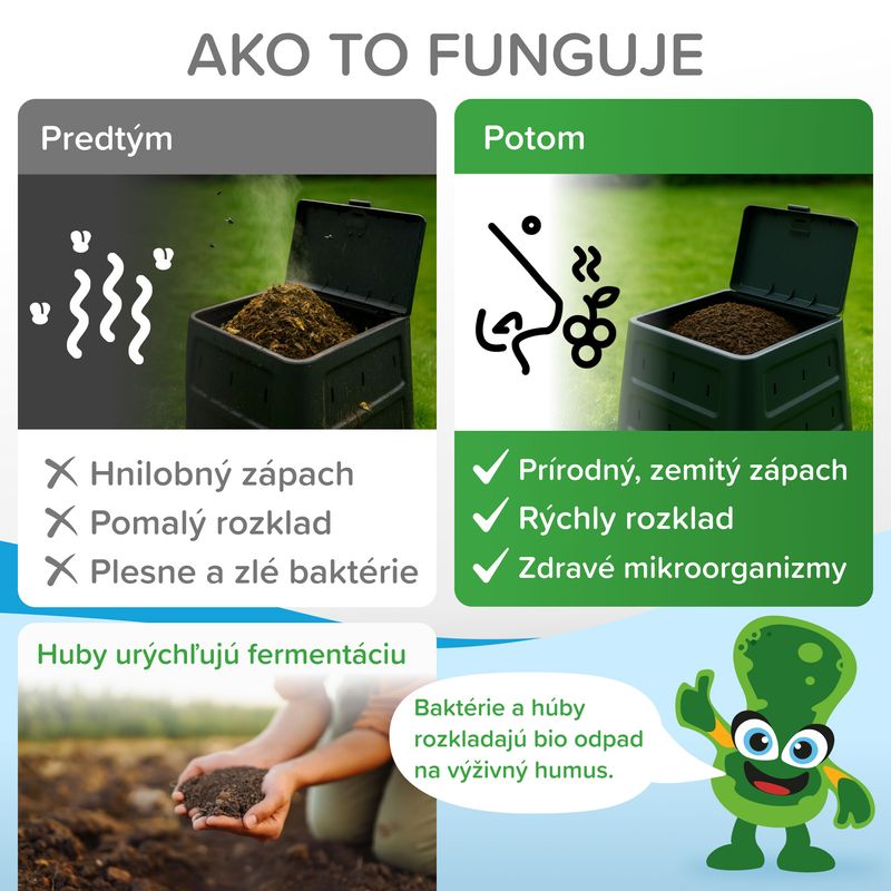 - Urýchľuje zrenie kompostu až o 3 mesiace.