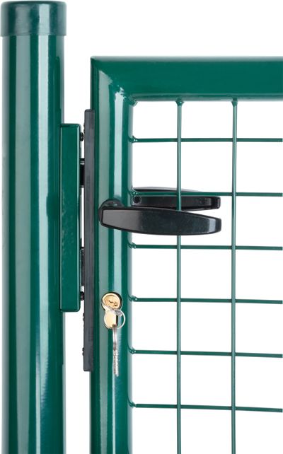 Záhradná jednokrídlová brána s výplňou zváranej siete s okami vo veľkosti 50 x 50 mm a hrúbkou drôtu 4 mm. Úprava je zinok + PVC. Farba zelená. Výška produktu = výška bránky od terénu po vrch krídla.