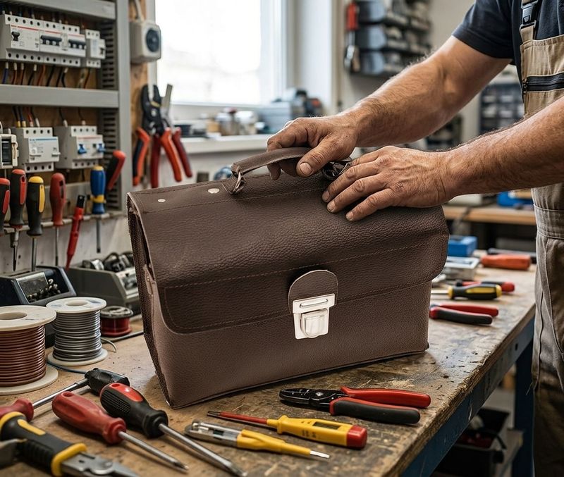 Brašňa elektrikárska v podobe kufra má jednu pracku a úchytku na zdvíhanie. S dvoma priehradkami.