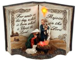 Dekorácia MagicHome Betlehem v biblii je vkusným doplnkom vášho interiéru počas vianočných sviatkov. Je to dekorácia s LED osvetlením. Farba LED je teplá biela a počet LED je 2 ks. Disponuje funkciou jednoduchého svietenia, blikania a spínačom ON/OFF. Menovité napätie reťazca je 3 V a menovitý príkon reťazca je 0,6 W. Napájanie zabezpečujú 2 x AA batérie. Dekorácia je vyhotovená z polyresinu. Svetelné zdroje nie sú vymeniteľné. Slúži len na vnútorné používanie.