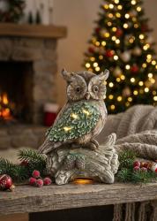 - Dekorácia MagicHome Vianoce, Sova na kmeni, 9 LED, 3xAAA, keramika, 31x21x42 cm