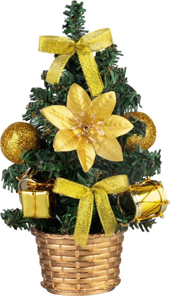 Stromček je zasadený v zlatom košíku, ktorý zvyšuje jeho stabilitu a zároveň podčiarkuje jeho vianočný charakter. Dekorácia prinesie do vášho domova útulnú sviatočnú atmosféru a stane sa pekným doplnkom k vianočnej výzdobe.
