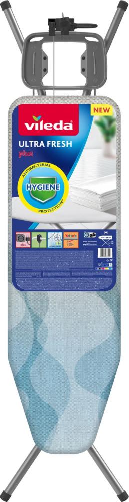 Žehliaca doska Vileda Ultra Fresh Plus je stabilná doska z oceľového pletiva. Možnosť nastaviť výšku: 77 - 97 cm. Má antibakteriálny poťah zo 100 % bavlny s 8 mm antibakteriálna penová výplň. Obsahuje držiak na žehličku so silikónovými časťami a železný stojan s priestorom na zavesenie vešiakov.