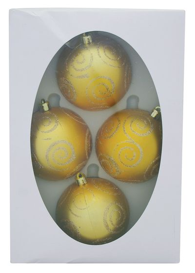 Súprava ozdôb na stromček slúži na slávnostné ozdobenie vianočného stromčeka. Pozostáva zo 4 ks gulí s ornamentmi s priemerom 7 cm. Farba gulí je zlatá.