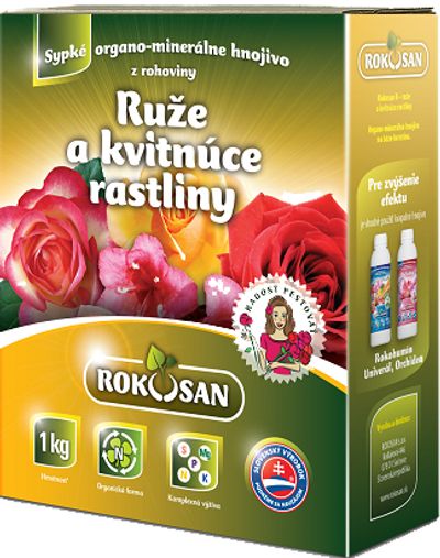 Rokosan Ruže a kvitnúce rastliny obsahuje mletú rohovinu s obsahom dusíka v organickej forme s prídavkom minerálnych živín. Výborné výsledky pri použití tohto hnojiva sú dané práve pomalým uvoľňovaním dusíka, ktorý je súčasťou rohoviny. Plne vyhovuje nárokom na živiny, ktoré majú ruže a stálo kvitnúce rastliny. Pri použití hnojiva dochádza k harmonickému príjmu živín a ochrane životného prostredia pred dusičnanmi a ťažkými kovmi. Ruže a stálo kvitnúce rastliny na vhodnú skladbu živín reagujú početnými a plnými kvetmi. Prítomnosť horčíka zabezpečí farebnú sýtosť kvetov. Rohovinou sa nedá prehnojiť, priaznivo pôsobí na rastlinu aj pôdu.