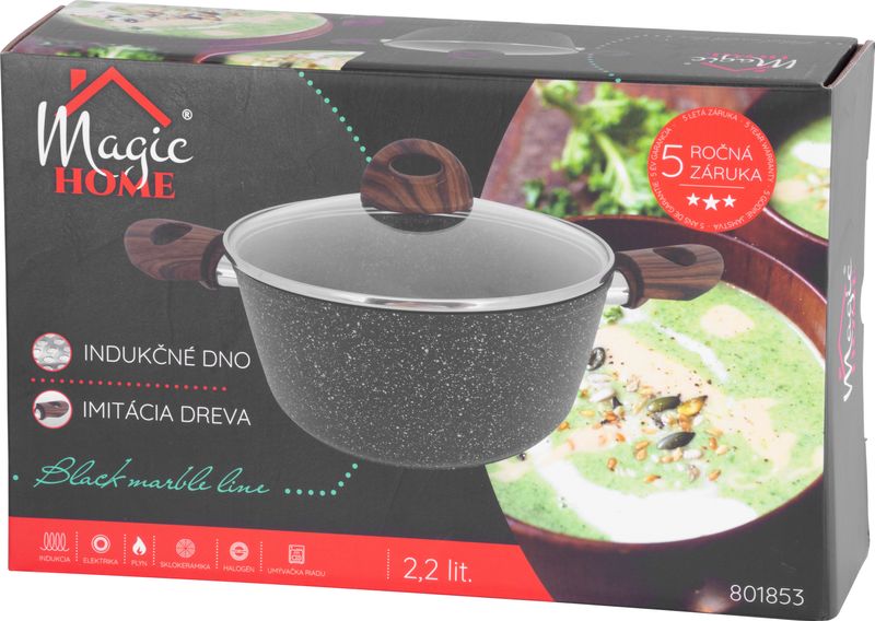 Ak si potrpíte nakvalitnékuchynské riady, tento hrniec je pre Vás ako stvorený. Hrniec s pokrievkou MagicHome Black Marble Line jevyrobený zo zliatiny hliníka s nepriľnavým povrchoma3-vrstvovým mramorovým náterom. Má3 mm indukčné dno, ktoréšetrí energiu. Rukoväť obsahuje drevený náter s ochranou proti plameňu. Hrniec jevhodný na všetky typy sporákov: indukcia, elektrika, plyn, sklokeramika a halogén a je tiež vhodný do umývačky riadu. Nevhodný do rúry. Ješetrný k životnému prostrediu, neobsahuje PFOA, PFOS, VOC, PB ani CD. Objem: 2,2 litre.