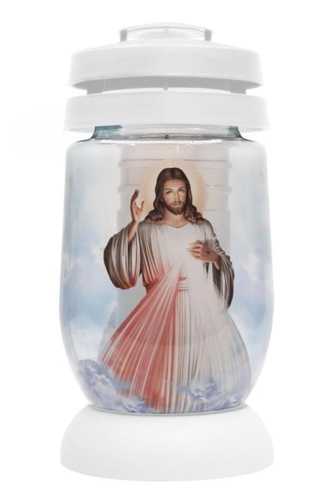 Kahanec s obrazom Ježiša s bielymi akcentmi. Vyrobené z kvalitného priehľadného skla, cez ktoré je krásne vidieť plameň. Vďaka veľkej základni je veľmi stabilný a vďaka špeciálnej štruktúre a "čiapke" je vložka vo vnútri dokonale chránená proti vetru a vode. Elegantný a moderný, vyzerá skvele ako hlavná dekorácia náhrobných kameňov.