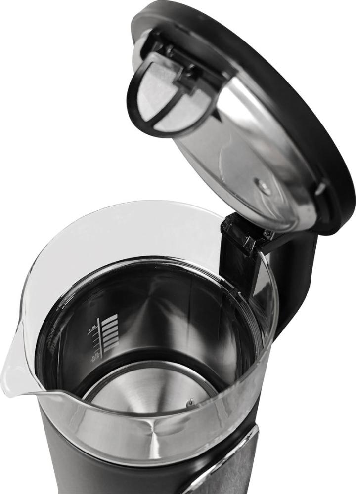 Elegantné čierne prevedenie so sklenenou nádobou dodáva kanvici moderný vzhľad. Praktická mierka objemu vody umožňuje jednoduchú kontrolu hladiny a ergonomická rukoväť zabezpečuje pohodlné a bezpečné používanie.