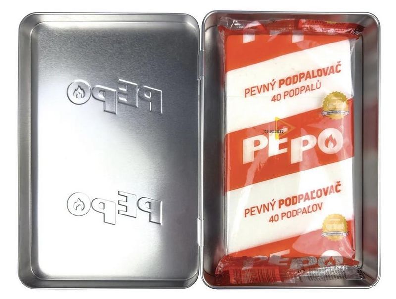 PE-PO plechová krabička slúži na bezpečné uloženie podpaľovača. Táto limitovaná edícia k 60. výročiu založenia značky PE-PO obsahuje 1 ks PE-PO pevného podpaľovača - fólia.