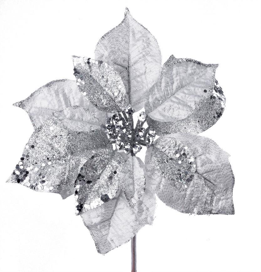 Kvet MagicHome Vianoce Poinsettia GlitterSilver, strieborná, stonka, veľkosť kvetu: 23 cm,