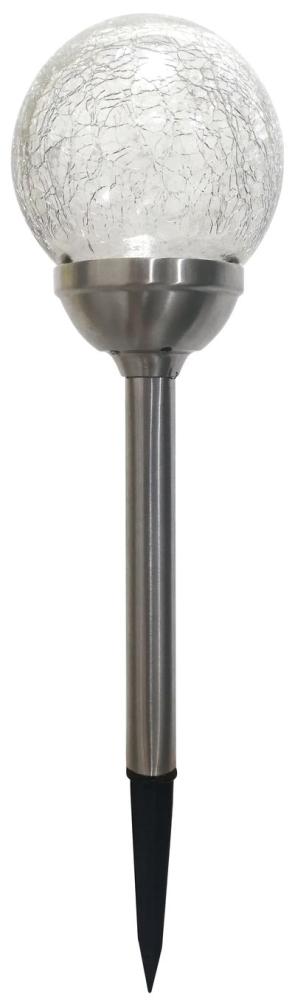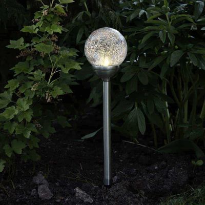 Štýlová záhradná solárna lampa je moderným doplnkom každej záhrady, svieti teplou bielou farbou alebo farebne, skvele sa hodí ku chodníku či kvetinovému záhonu. Má dizajn popraskanej gule. Je vyrobená z kvalitnej nehrdzavejúcej nerezovej ocele a skla. Počas dňa solárny panel konvertuje slnečnú energiu na elektrickú energiu, ktorá sa ukladá do dobíjateľnej batérie. V noci sa svetlo automaticky zapne a využíva uloženú energiu. Lampa tak prostredníctvom 2x LED diód svieti príjemným svetlom. Rozmery tejto lampy sú 12x44 cm.