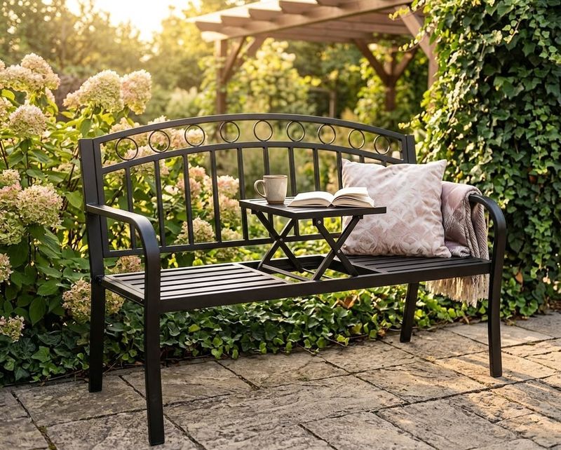 Lavička je vyrobená z pevnéhokovu, čo zaručujestabilitu, odolnosť voči poveternostným podmienkamadlhú životnosť. V strede sa nachádzapraktický odkladací stolček, ideálny na nápoje, knihu alebo dekorácie.