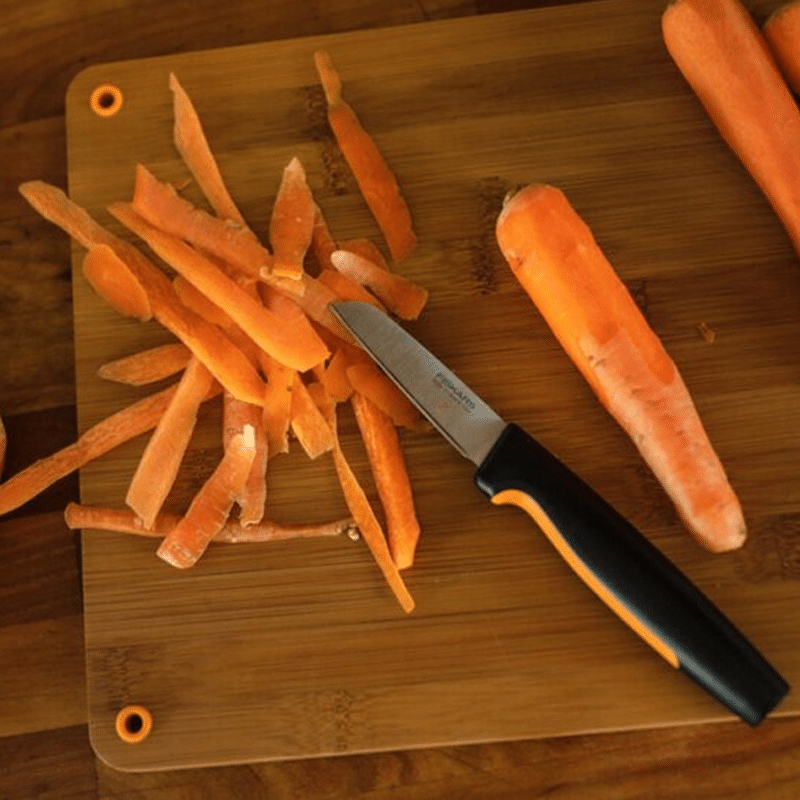 - Kompaktný a ľahký nôž, ktorý je ideálny pre lúpanie a krájanie malého ovocia a zeleniny. Ľahko s ním oškriabete nové zemiaky či mrkvu, práve tak aj rozkrájate slivky alebo nakrájate malú cibuľu.