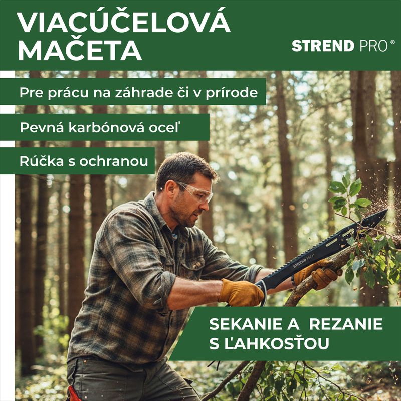 Mačeta Strend Pro Tactical pre všetky práce v lese či na záhrade. Extra ostrá čepeľ s pílkou umožňuje presné a čisté rezy bez námahy. Komfortná rukoväť s ochranou ruky chráni pred zbytočným zranením. Disponuje praktickým putkom na zavesenie za opasok. Spolu s puzdrom s klipsom na rukoväť tak získate vhodne zabalenú mačetu na bezpečnú prepravu počas prác v lese a záhrade. Čierny náter chráni ostrie pred koróziou. Celková dĺžka mačety je 61 cm.