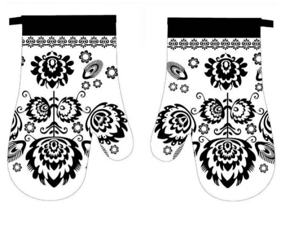 Tradičný bielo-čierny folklórny motív v modernom prevedení dodá vašej kuchyni šmrnc a ochráni vás pri varení. Praktická sada dvoch chňapiek – pre pravú aj ľavú ruku – je štýlová a funkčná zároveň.
