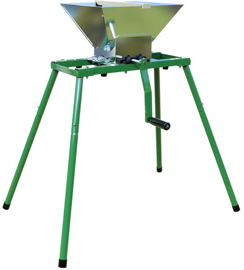 Mlynček je skonštruovaný s dôrazom na odolnosť a praktickosť. Pracovná časť je vyrobená z nerezovej ocele, čo zaručuje hygienickú bezpečnosť pri kontakte s potravinami a dlhú životnosť aj pri pravidelnom používaní. Plastové zuby šetrne spracúvajú bobule hrozna – rozdrvujú ich bez poškodenia peciek, čím sa minimalizuje uvoľňovanie horkých látok do muštu. Stabilný kovový stojan so štyrmi nohami zabezpečuje pevné postavenie počas celého procesu mletia a zároveň umožňuje pohodlné podstavenie nádoby priamo pod mlynček.