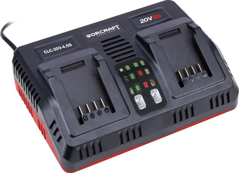 Nabíjačka Worcraft CLC-20V-4.5D s funkciou rýchleho nabíjania je určená na nabíjanie 2 akumulátorov značky Worcraft s kapacitou 2 Ah a vyššie. Približná doba nabíjania predstavuje: 2,0 Ah - 55 min, 4,0 Ah - 65 min, 6,0 Ah - 85 min. Zabudovaný inteligentný čip MCU dokáže rozpoznať rôzne modely Worcraft akumulátorov a pre zabezpečenie ich čo najdlhšej životnosti pri nabíjaní použiť rôzny maximálny nabíjací prúd podľa modelu akumulátora.
