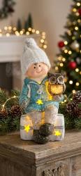 - Postavička MagicHome Vianoce, Chlapček sediac na taburetke so sovičkou, 1 LED, polyresin,