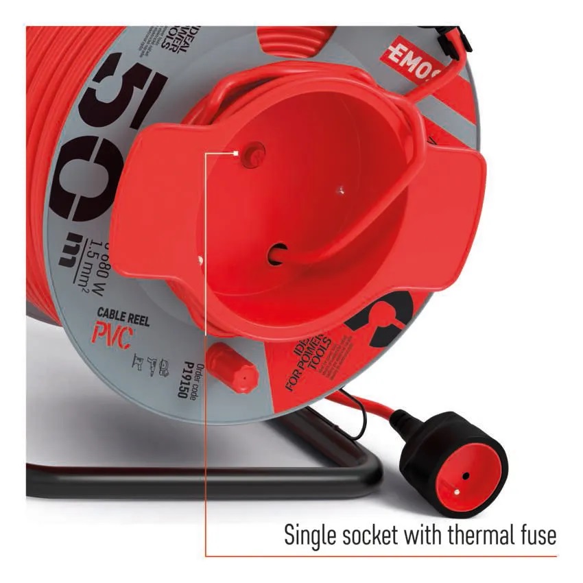 Oranžový predlžovací kábel na bubne - spojka s dĺžkou 50 m, prierezom vodiča 1,5 mm2 a tepelnou poistkou. Vhodný pre maximálnu záťaž 16 A max. / 3680 W pri plne rozvinutom stave a 4,8 A max. / 1100 W navinutý.