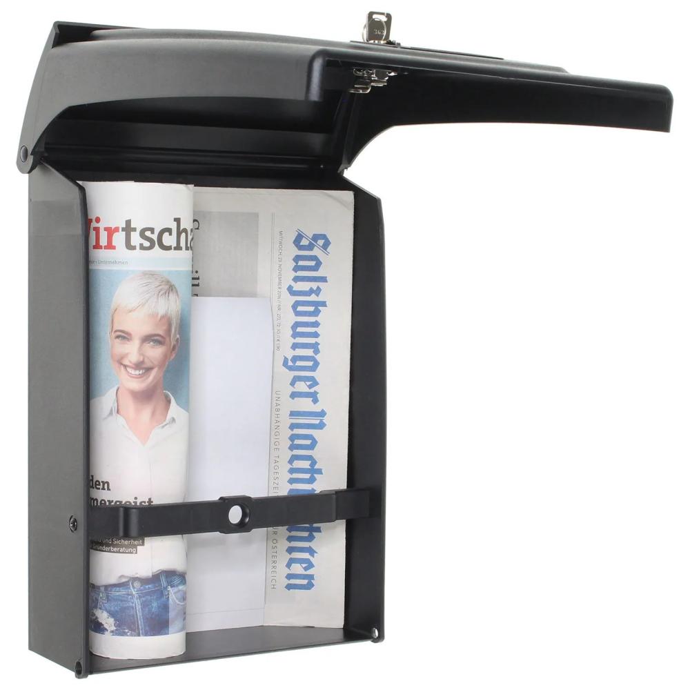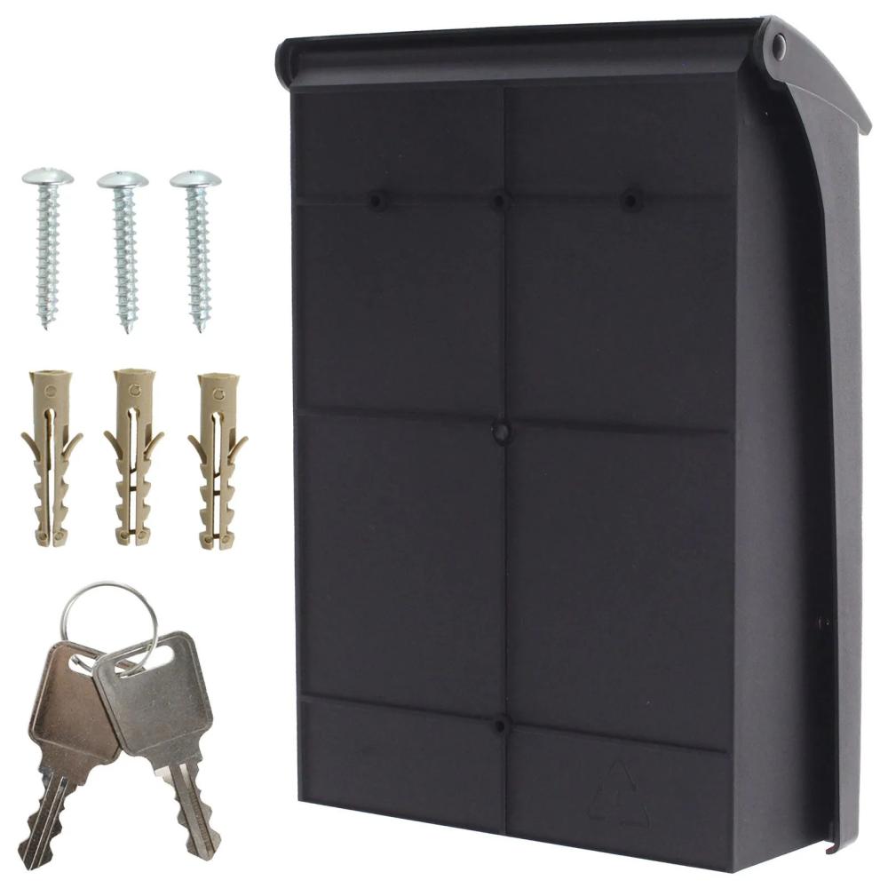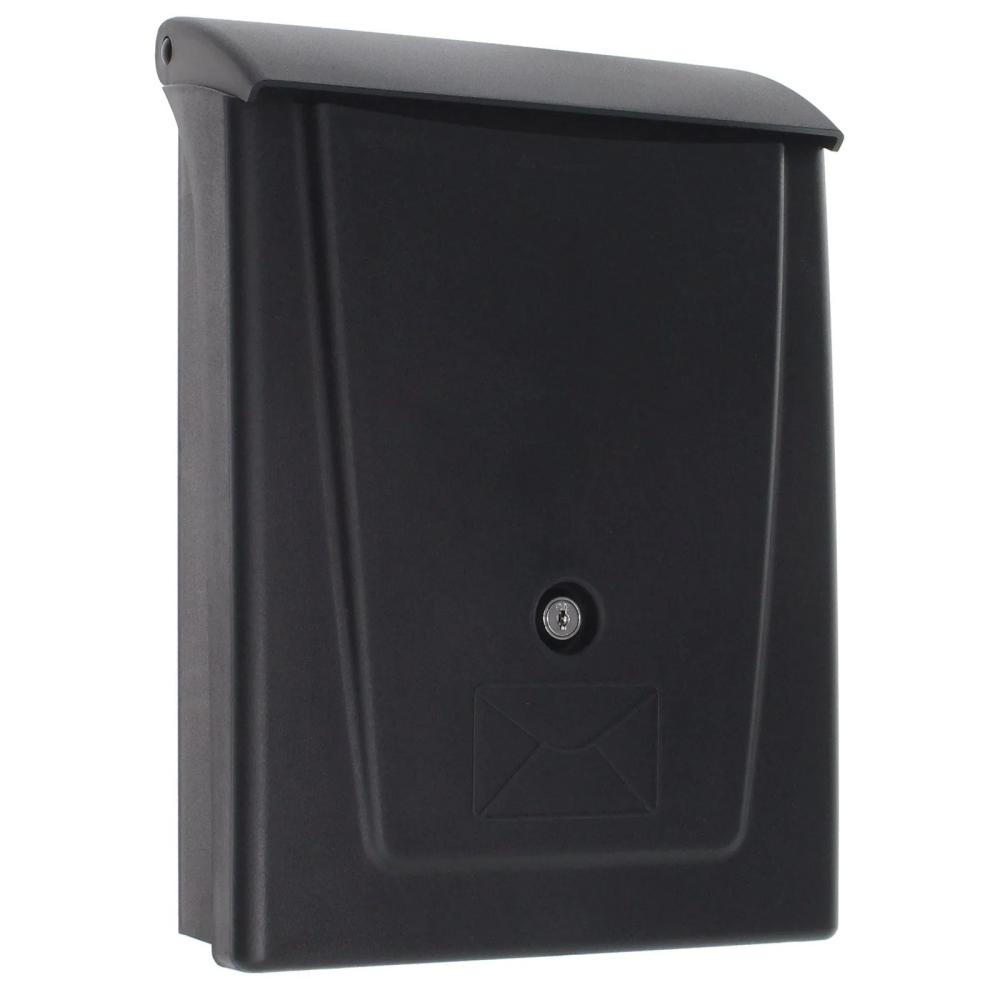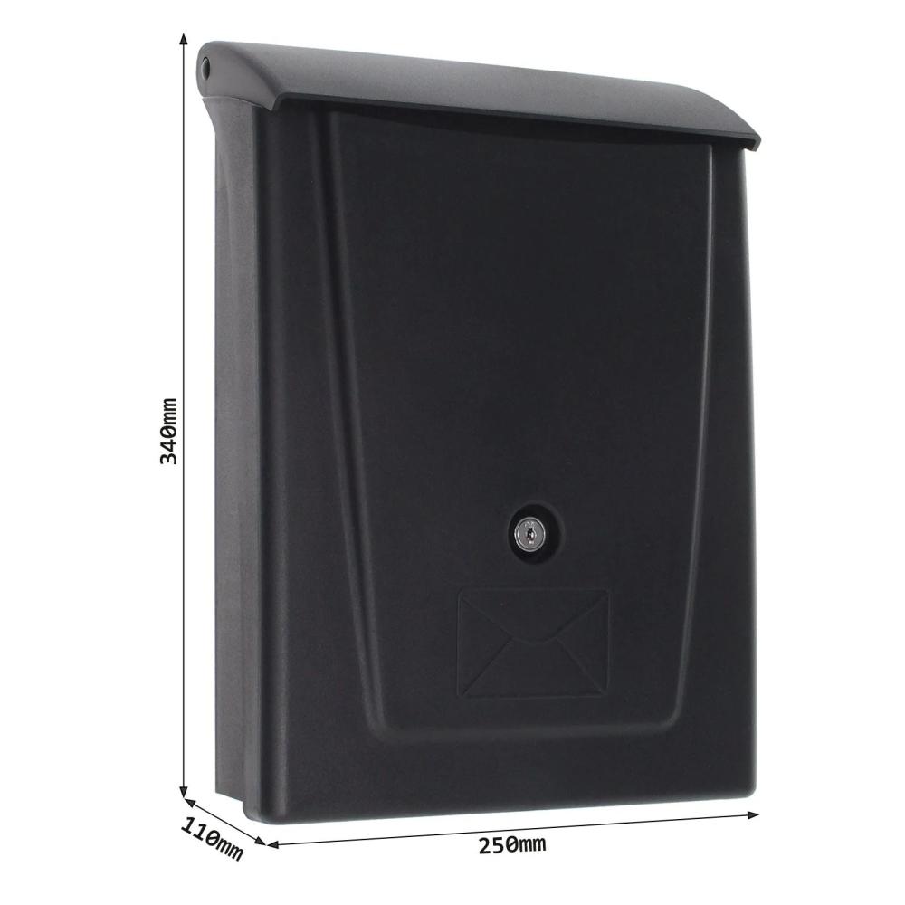 Čierna plastová poštová schránka ponúka výbornú voľbu, ako skrášliť prostredie okolo vášho domu. Poštová schránka má klasický cylindrický zámok dodávaný spolu s 2 kľúčmi. Plastová schránka disponuje horným vhodom spolu s plastovou strieškou. Cez vhod je možné vhodiť zásielky až do veľkosti A4. Doručenú poštu jednoducho vyberiete cez veľké dvierka, ktoré nemajú priestor na menovku. Na zadnej strane sú pripravené otvory an upevnenie na fasádu domu, plot alebo múr. Materiál na upevnenie je súčasťou balenia.
