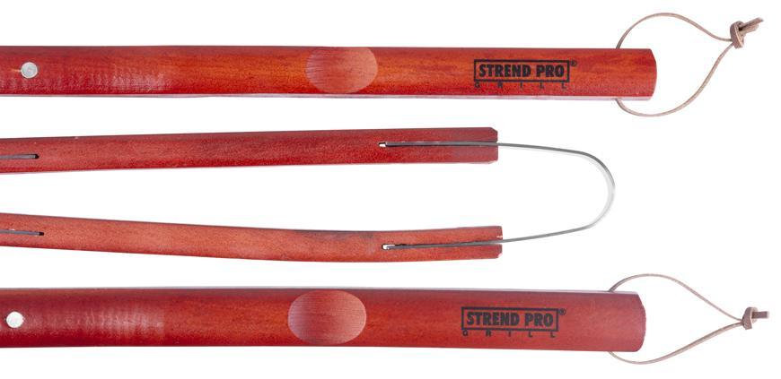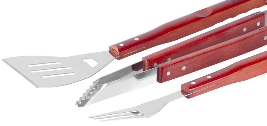 Sada na gril obsahuje tri kusy náradia - grilovaciu ihlicu, obracačku a grilovacie kliešte. Náradie je vyrobené z nehrdzavejúcej ocele, po použití sa ľahko umýva. Rukoväte sú drevené. Majú praktické očká na zavesenie.