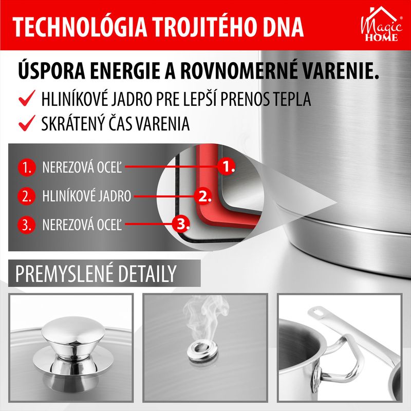 - Trojité dno: Rovnomerné rozloženie tepla vďaka hliníkovému jadru umožňuje efektívne varenie bez nepríjemných horúcich miest a s nižšou spotrebou energie.