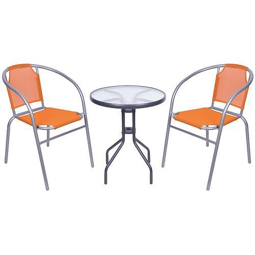 Balkónový set pozostáva z dvoch stoličiek a jedného okrúhleho stola. Set je ideálnym funkčným doplnkom pre posedenie, počas teplých letných dní. Hlavné konštrukcie nábytkov sú vyrobené z kovu. Povrch stoličiek je pokrytý pevnou sieťovinou oranžovej farby. Povrch stola je zasa vyrobený z tvrdeného skla. Rozmery jednej stoličky sú 60 x 71 cm a rozmery stola sú 72 x 59 cm. Set je potrebné umiestniť na rovný povrch.