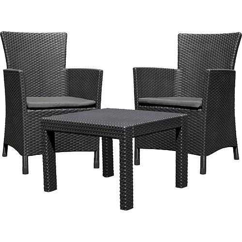 Terasový set je ideálnym doplnkom pre posedenie a oddych. Má atraktívny moderný dizajn a je v grafitovej farbe. Set pozostáva zo stola a dvoch kresiel. Celý nábytok je vyrobený z odolného polypropylénu, ktorý predstavuje imitáciu ratanu. Výhodou tohoto materiálu, oproti ratanu, je jeho odolnosť voči UV žiareniu a poveternostným podmienkam. Nábytok si preto nevyžaduje žiadne špeciálne ošetrenia. Montáž nábytku je veľmi jednoduchá. Rozmery stola sú 43 x 59 x 59 cm. Rozmery jedného kresla sú 89 x 60 x 59 cm. Chrbtová opierka je teda dostatočne vysoká na opretie nie len chrbta, ale aj hlavy. Súčasťou balenia sú taktiež dve podušky v sivej farbe, ktoré poskytujú maximálny komfort na sedenie.
