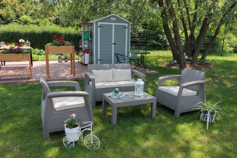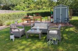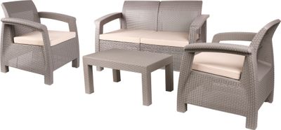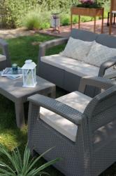 Set kresiel a stola je určený pre využitie najmä na terasách. Je vyrobený z odolného polypropylénu, ktorý je veľmi podobný ratanu. Poskytuje odolnosť voči UV žiareniu a poškodeniu pred poveternostnými podmienkami. Je krásnej tmavej farby a má atraktívny moderný dizajn. Montáž setu je veľmi jednoduchá, nebudete na ňu potrebovať žiadne špeciálne náradie. Balenie pozostáva zo stola, dvoch 1-miestnych kresiel a jedného 2-miestneho kresla. Rozmery 2-miestnej pohovky sú 120 x 70 x 80 cm, rozmery 1-miestnych kresiel sú 65 x 70 x 80 cm a rozmery stola sú 40 x 80 x 60 cm. Súčasťou balenia sú tiež podsedáky ku kreslám, v krásnej béžovej farbe, ktorými bude sedenie na terase ešte príjemnejšie a pohodlnejšie.