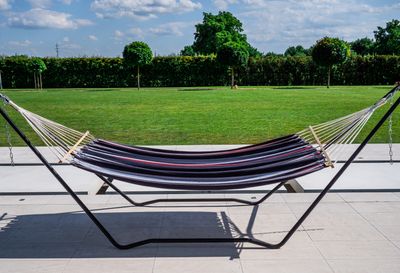 Sieť je určená pre hojdanie a je vyrobená z bavlneného plátna. Má zaujímavú modro-červeno-bielu farebnú kombináciu. Je skvelým prostriedkom pre oddych. Nosnosť siete je 200 kg a jej rozmery sú 200 x 150 cm. Sieť je spevnená drevenými časťami na oboch koncoch. Sieť je potrebné bezpečne zavesiť na stojan určený pre hojdacie plátna.