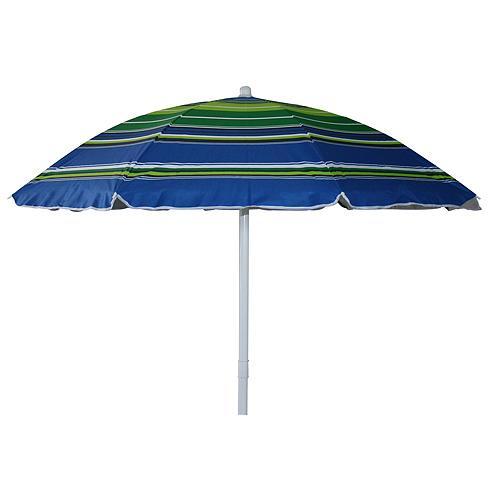 Slnečník je príjemnej modrej farby, obzvláštený potlačou zelených a bielych pásov. Vďaka vrchnému pokrytiu z polyesteru zabezpečuje odlnosť voči slnečnému žiareniu a iným vonkajším vplyvom. Priemer vrchnej časti je 180 cm, čím poskytuje pokrytie väčšej oblasti. Priemer rebier, ktoré sú podporou pre vrchnú časť, sú 3 mm. Celá konštrukcia je vyrobená z pevnej ocele. S výškou 200 cm a priemerom 32/32 mm poskytuje stredová tyč dostatočnú pevnosť a stabilitu. Celková hmotnosť je 1,56 kg, čím je zabezpečená jednoduchá a ľahká manipulácia a prenos. Slnečník je vybavený plastovým náklonom.