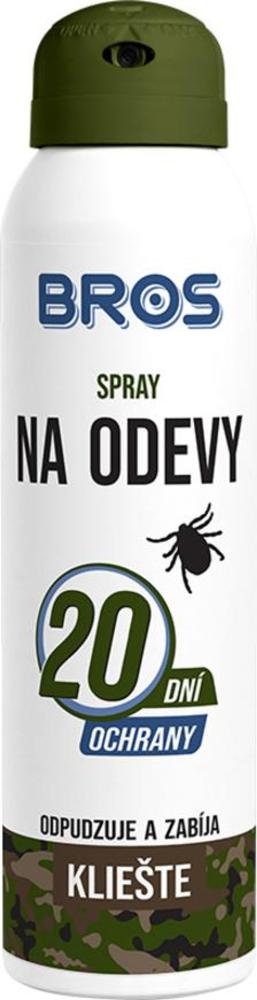 Sprej Bros chráni pred kliešťami a ochoreniami, ktoré prenášajú. Po aplikácii na odev a obuv kliešte nielen odpudzuje, ale aj zabíja. Účinkuje ihneď po aplikácii a účinnosť si zachováva po dobu 20 dní. POUŽITIE: Pred použitím pretrepte. Rovnomerne naneste na oblečenie a obuv zo vzdialenosti 15 cm.