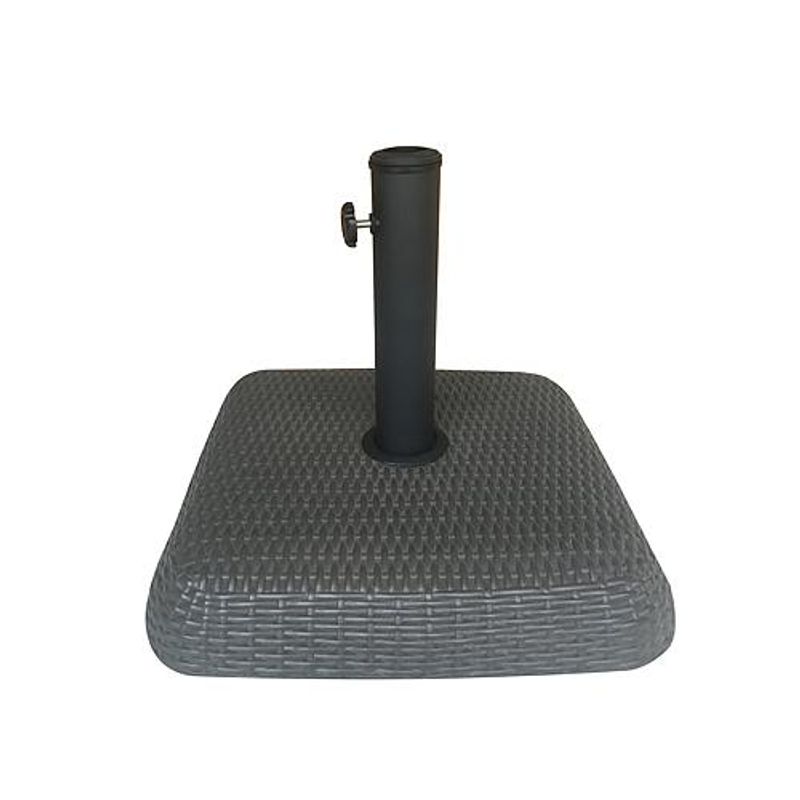 Stojan na dáždnik má štvorcovú podstavu a je vyrobený z betónu, čomu odpovedá aj jeho hmotnosť 29,7 kg. Výhodou takejto váhy je zabezpečená stabilita aj pre dáždniky s väčšími priemermi vrchných častí. Rovnako sa pri neprajných poveternostných podmienkach nemusíme báť o jeho prípadné odfúknutie či poškodenie. Zaujímavý je tiež dizajn, kedy sa celá betónová časť pokryla tmavohnedým pleteným poťahom. Priemer tejto podstavy je 46 cm a výška je 8 cm. Z podstavy vychádza tyč na ktorú sa následne napája dáždnik. Jednoducho ich do seba vsuniete a pomocou kolieska na boku ich zaistíte.