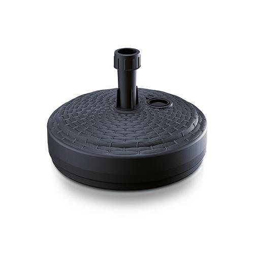 Stojan na slnečník je vyrobený z antracitového pevného plastu, ktorý je odolný voči atmosferickým vplyvom. Jeho hmotnosť je iba 681 g, čím sa stáva ideálnym kandidátom a pomocníkom aj na dovolenkách, keďže si ho viete zbaliť a priemiestniť kamkoľvek potrebujete. Spodná podstava je okrúhleho tvaru a jej veľkou výhodou je, že sa dá naplniť vodou alebo pieskom, čím sa dodrží potrebná váha pre bezpečné nasadenie slnečníka. Objem tejto spodnej časti je 10 l, čo je dostatočné pre vytvorenie potrebného závažia na spodnej časti stojanu. Rozmery sú 390 x 390 x 310 mm. Samotný slnečník sa pripevňuje veľmi jednoducho a to vsunutím a následným utiahnutím závitu na tyči nachádzajúcej sa v strede podstavy. Maximálny priemer tyče dáždnika, ktorý je možné upevniť, je 10 až 26 mm.
