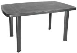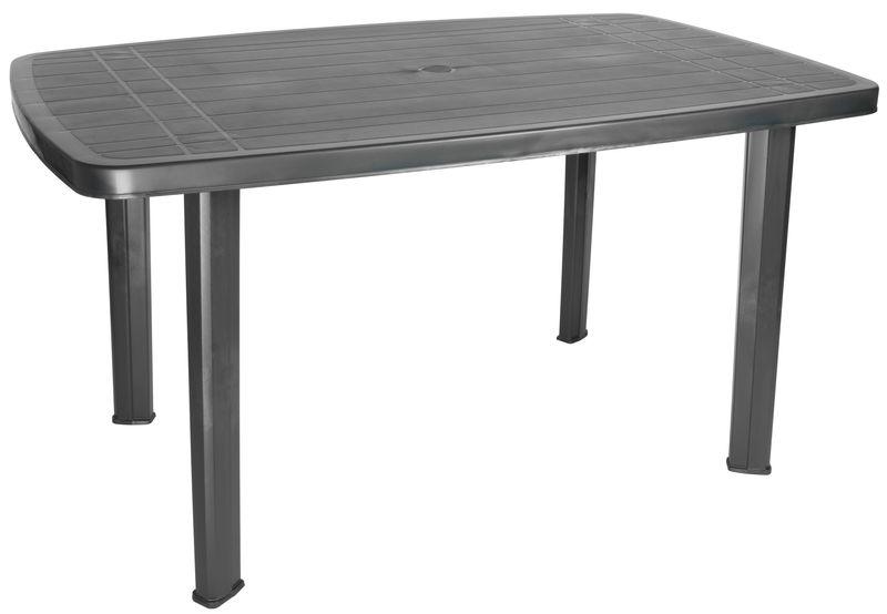 Klasický plastový stôl FARO je určený pre vonkajšie využitie. Stôl je možné umiestniť do záhrady alebo na terasu. Výhodou stola je otvor na slnečník v jeho strede, ktorý vám poskytne príjemné tienenie. Stôl je vďaka plastovému povrchu veľmi pevný, ale tiež ľahký na údržbu a skladanie. Rozmery stola sú 137 x 85 x 72 cm. Farba: antracit.