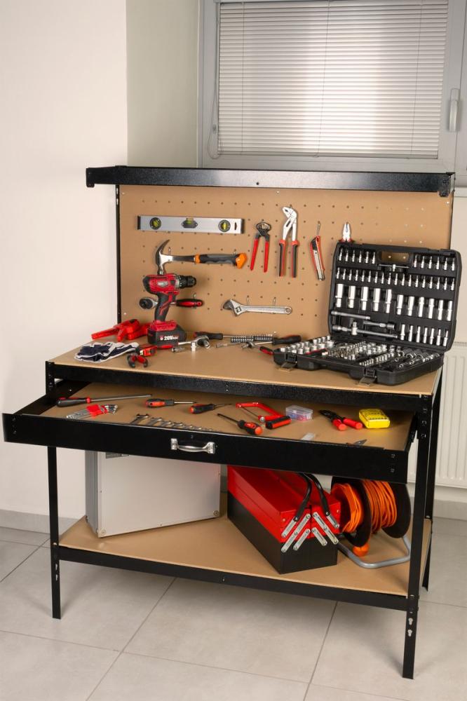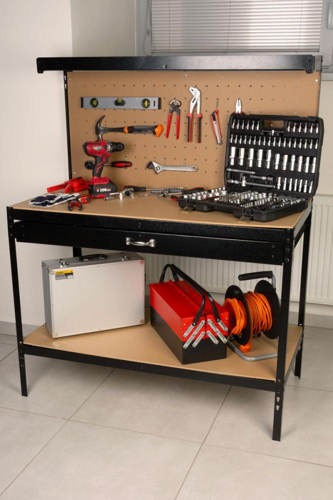 Pracovný stôl do dielne Racks je vyrobený z materiálov odolných voči mechanickým poškodeniam. Obsahuje praktickú poličku a zásuvku, do ktorých si môžete naukladať náradie a súčiastky. Skvelým doplnkom je perforovaná stena s nosnosťou 20 kg. Maximálna nosnosť pracovnej dosky pri rovnomernom rozložení je 100 kg, zásuvky 10 kg a police 100 kg. Jednoduchá montáž. Rozmery : 120x60x150 cm. Výška strednej pracovnej plochy: 90 cm.