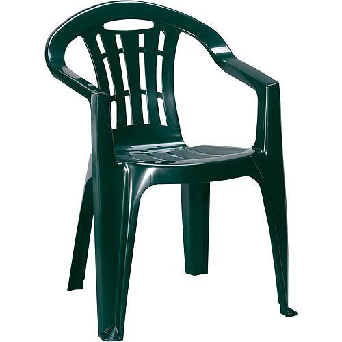 Stolička je určená pre využitie v záhrade, pre posedenie pri grilovaní a pod. Je zelenej farby, vyrobená z odolného plastu, ktorý sa vyznačuje vysokou životnosťou a odolnosťou voči poveternostným vplyvom. Stolička si vyžaduje naozaj jednoduchú údržbu a starostlivosť. Rozmery stoličky sú 56 x 58 x 79 cm a jej nosnosť je 100 kg. Súčasťou stoličky sú lakťové opierky na oboch stranách. Výhodou však je, že výška lakťových opierok je prispôsobená tak, aby bola stolička stohovateľná.
