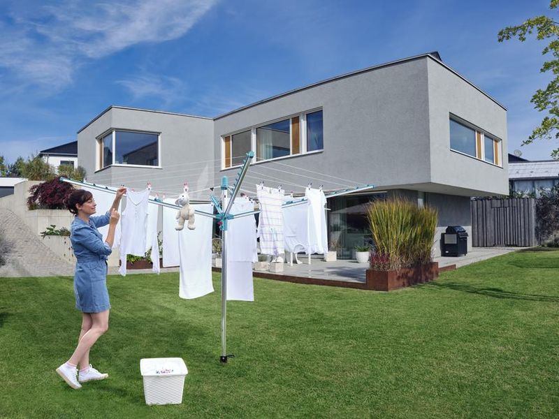 Vonkajší otočný sušiak, odolný voči vplyvom počasia, nehrdzavejúci hliníkový rám, patentovaný systém zaťahovania šnúr do bočníc. Šnúry sú chránené pred dažďom a špinou, mechanizmus pre ideálne vypnutie šnúr, možnosť zavesenia ramienok na konce ramien sušiaku. 50 m šnúr = 5 práčok bielizne. Súčasťou balenia je držiak na zabetónovanie.