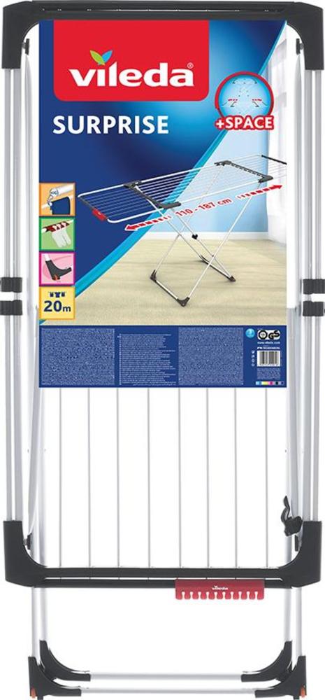 Vileda Surprise je vnútorný sušiak, ktorý je ideálny pre kohokoľvek s obmedzeným úložným priestorom. Jeho praktický a kompaktný dizajn a možnosť rozšíriť bočné krídla tak, aby ste získali viac priestoru.
