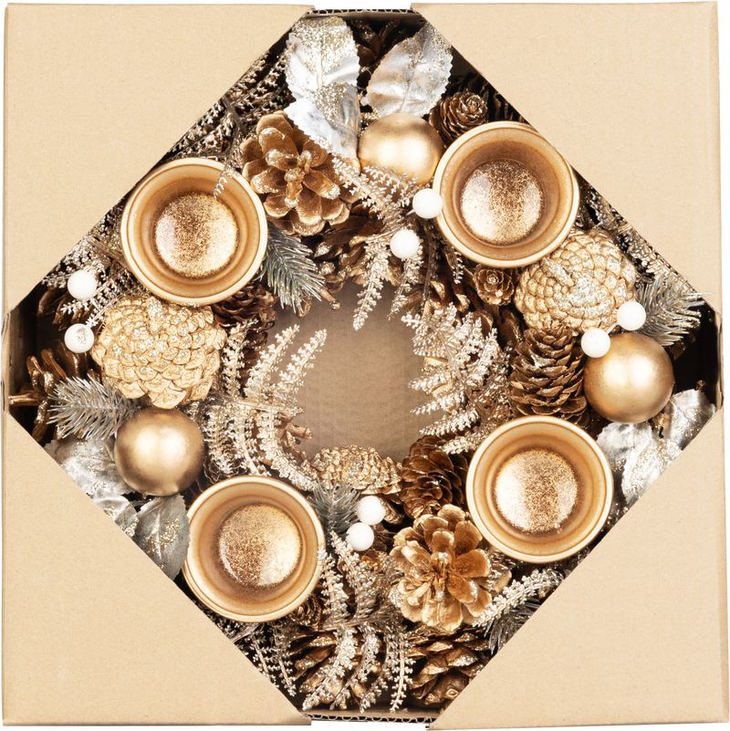 Doprajte si dokonalú vianočnú atmosféru s elegantným adventným vencom MagicHome. Je vyrobený v luxusnej zlatej farbe a zdobený prírodnými šiškami, dekoratívnymi guľôčkami a listami, ktoré dodávajú sviatočnému obdobiu štýlový lesk. Štyri svietniky na sviečky poskytujú ideálne rozdelenie pre zapálenie adventných sviec počas štyroch týždňov pred Vianocami.