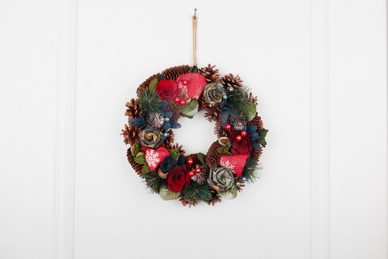 Dizajnový vianočný veniec MagicHome prinesie do vášho domova nádych elegancie a sviatočnej atmosféry. Veniec je zdobený prírodnými šiškami, dekoratívnymi kvetmi a ozdobnými guľôčkami v modro-červených tónoch, ktoré vytvárajú moderný a pritom teplý vzhľad.