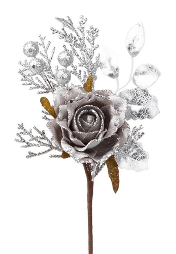 - X Vetvička MagicHome Vianoce, s ružou, sivá, 26 cm, bal. 6 ks